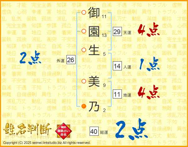 御(11画)園(13画)生(5画) 美(9画)乃(2画)
