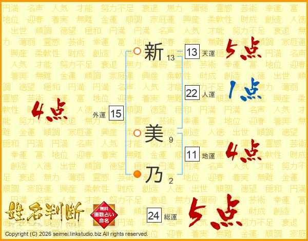 生活面を象徴する運勢です。外部から受ける影響力を表し、結婚運、家庭運や職場、環境への順応性を表します。総運から人運を引いた画数。姓や名が1文字の場合を除く。