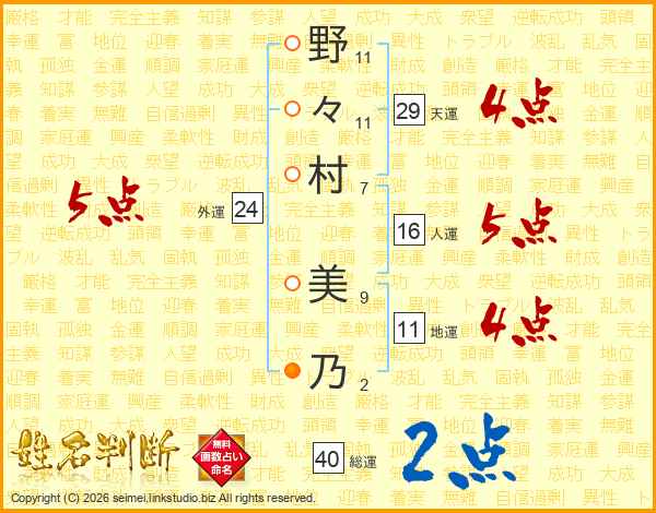 野(11画)々(11画)村(7画) 美(9画)乃(2画)