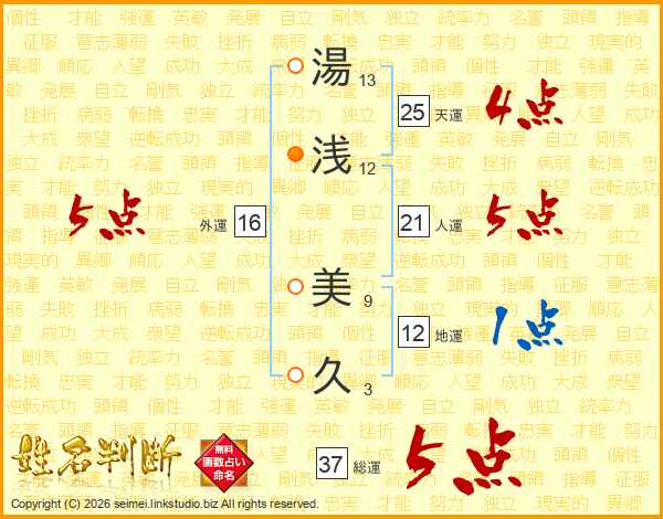 湯浅美久さんの総運は37画の5点!