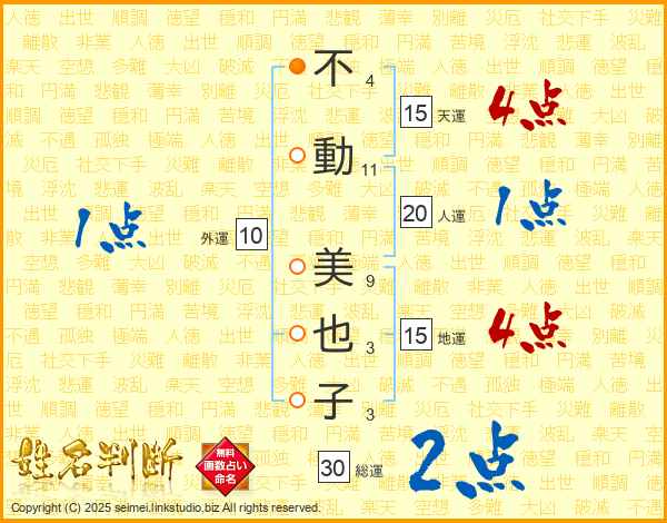 不(4画)動(11画)  美(9画)也(3画)子(3画)