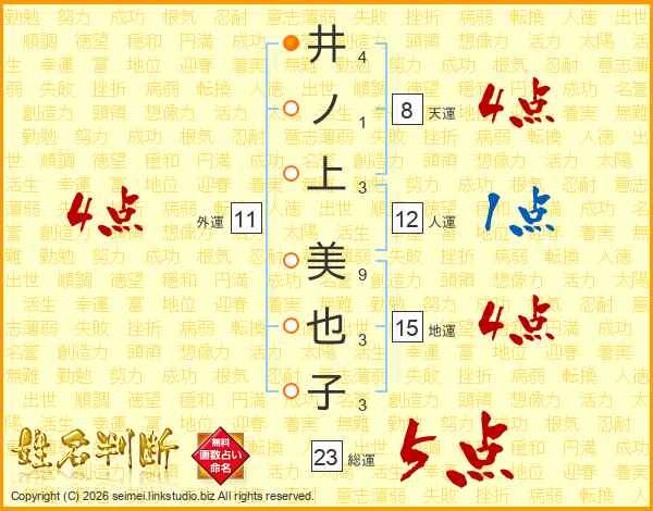 井(4画)ノ(1画)上(3画) 美(9画)也(3画)子(3画)