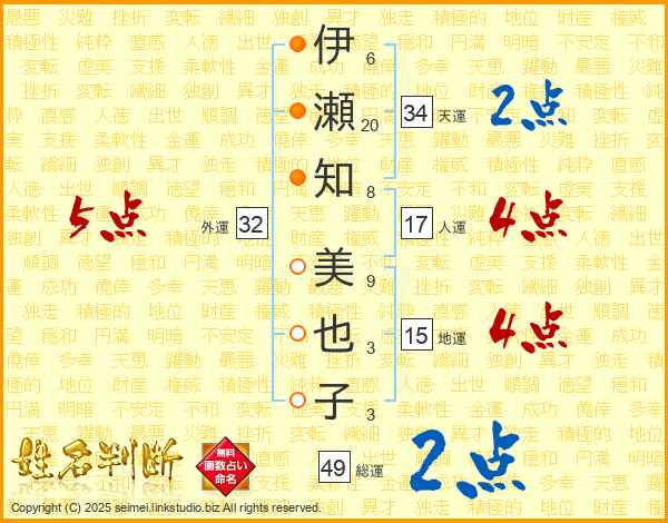 伊(6画)瀬(20画)知(8画) 美(9画)也(3画)子(3画)