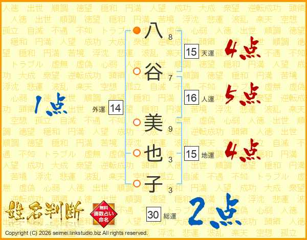 八(8画)谷(7画) 美(9画)也(3画)子(3画)