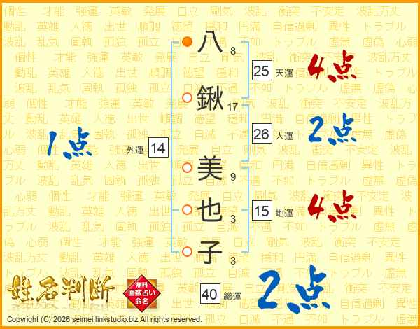 八(8画)鍬(17画) 美(9画)也(3画)子(3画)