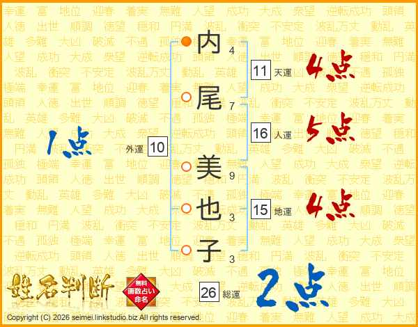 内(4画)尾(7画) 美(9画)也(3画)子(3画)