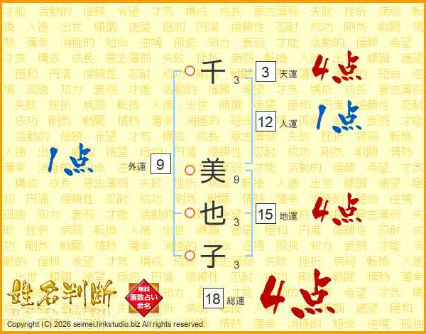 生活面を象徴する運勢です。外部から受ける影響力を表し、結婚運、家庭運や職場、環境への順応性を表します。総運から人運を引いた画数。姓や名が1文字の場合を除く。