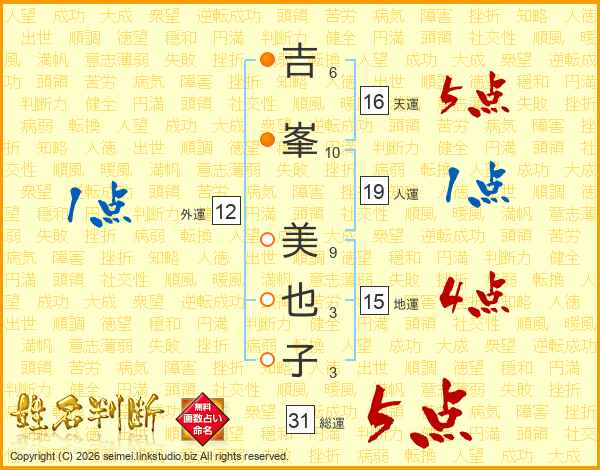 吉(6画)峯(10画) 美(9画)也(3画)子(3画)