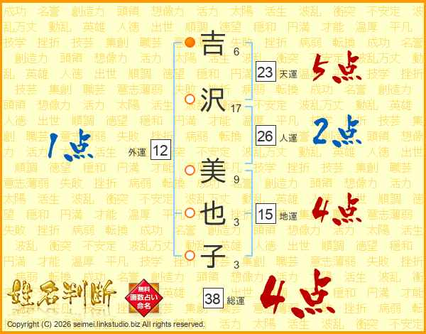 吉(6画)沢(17画) 美(9画)也(3画)子(3画)