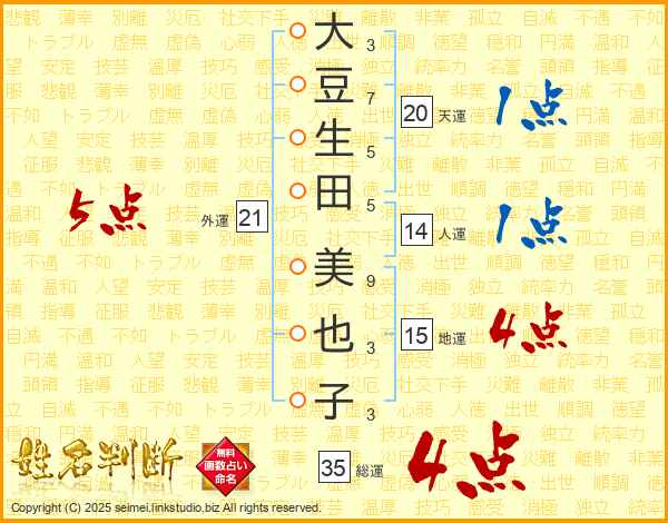 大(3画)豆(7画)生(5画)田(5画) 美(9画)也(3画)子(3画)