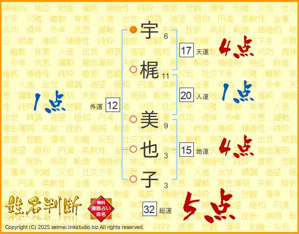 宇(6画)梶(11画) 美(9画)也(3画)子(3画)
