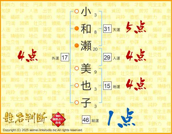小(3画)和(8画)瀬(20画) 美(9画)也(3画)子(3画)