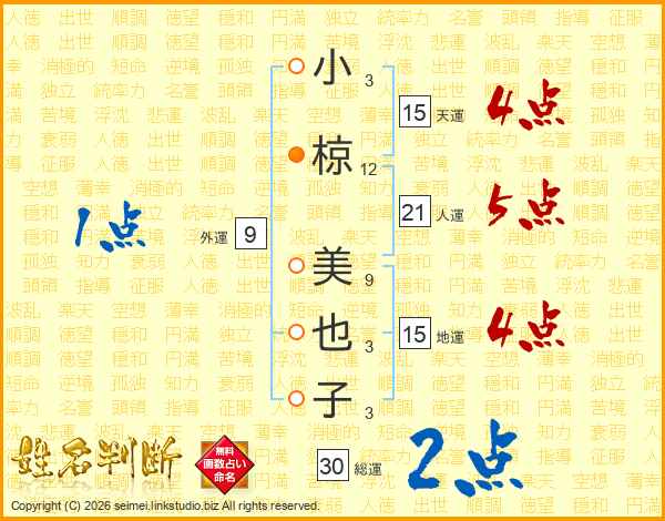 小(3画)椋(12画) 美(9画)也(3画)子(3画)