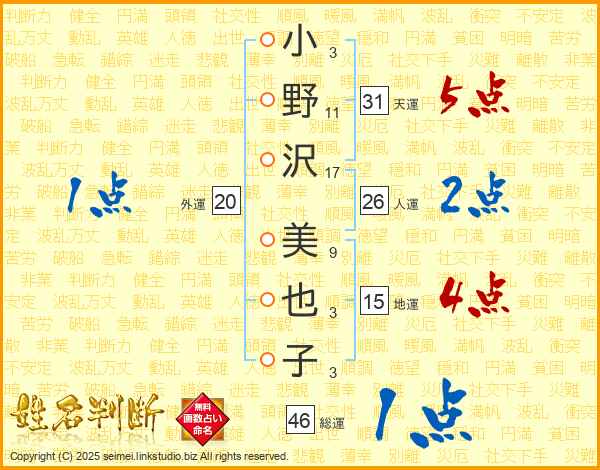 小野沢美也子さんの総運は46画の1点!