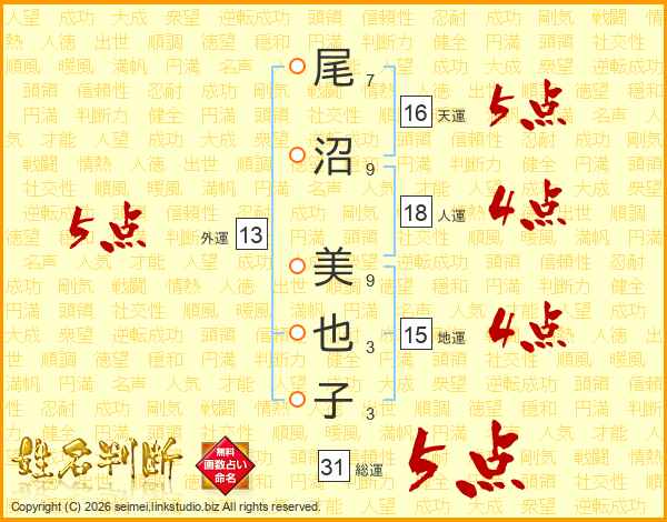 尾(7画)沼(9画) 美(9画)也(3画)子(3画)
