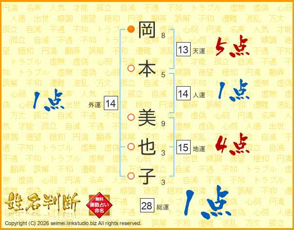 岡(8画)本(5画) 美(9画)也(3画)子(3画)