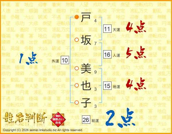戸(4画)坂(7画) 美(9画)也(3画)子(3画)