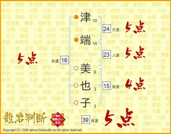 津(10画)端(14画) 美(9画)也(3画)子(3画)