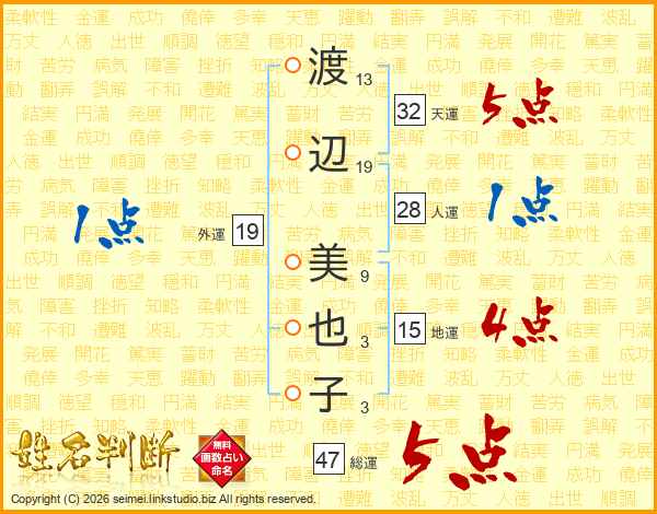 渡辺美也子さんの総運は47画の5点!