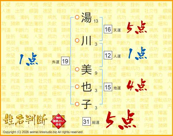 湯(13画)川(3画) 美(9画)也(3画)子(3画)
