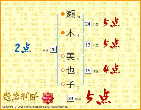 瀬木美也子さんの総運は39画の5点!