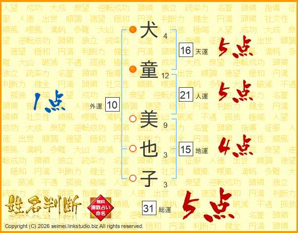 犬(4画)童(12画) 美(9画)也(3画)子(3画)