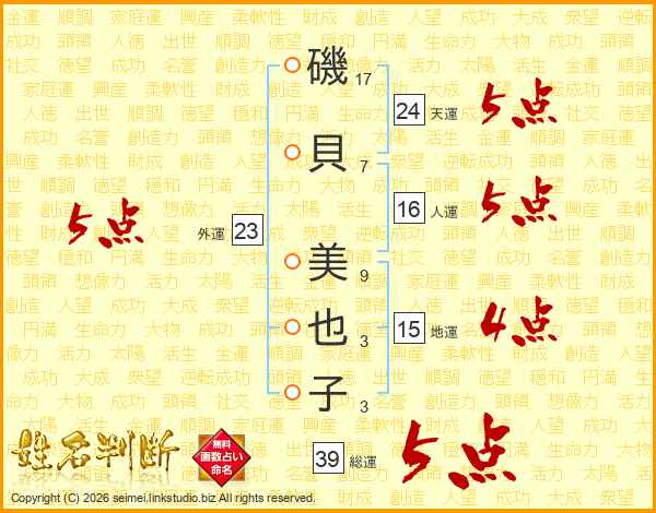 磯(17画)貝(7画) 美(9画)也(3画)子(3画)