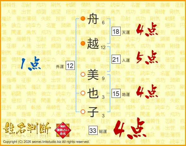 舟(6画)越(12画) 美(9画)也(3画)子(3画)