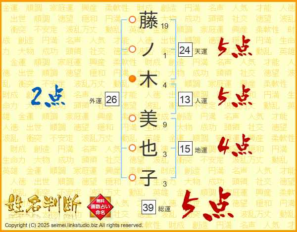 藤(19画)ノ(1画)木(4画) 美(9画)也(3画)子(3画)