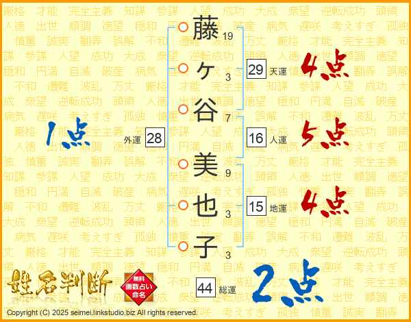 藤(19画)ヶ(3画)谷(7画) 美(9画)也(3画)子(3画)