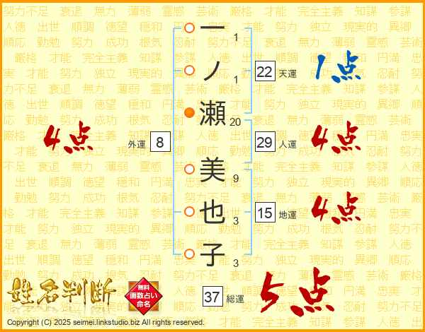 一(1画)ノ(1画)瀬(20画) 美(9画)也(3画)子(3画)