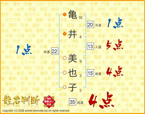 亀(16画)井(4画) 美(9画)也(3画)子(3画)