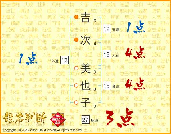 吉(6画)次(6画) 美(9画)也(3画)子(3画)