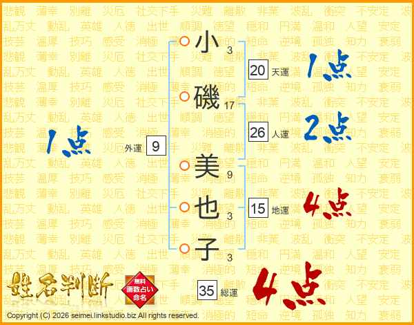 小(3画)磯(17画) 美(9画)也(3画)子(3画)