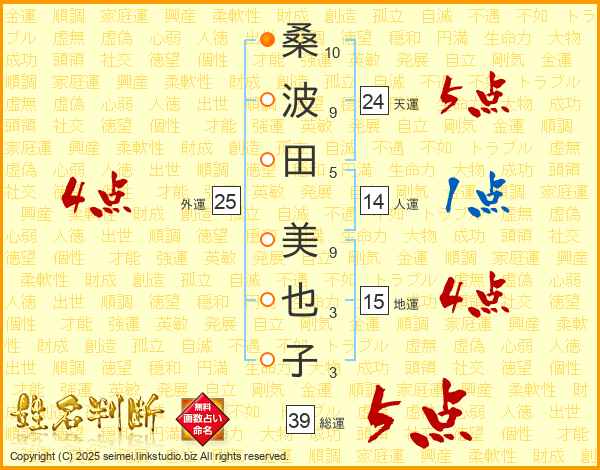 桑(10画)波(9画)田(5画) 美(9画)也(3画)子(3画)