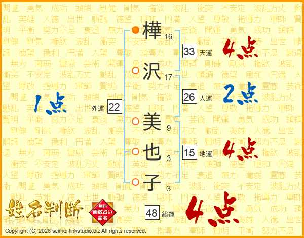樺沢美也子さんの天運は33画の4点!
