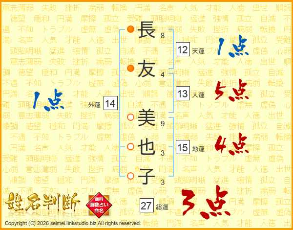 長(8画)友(4画) 美(9画)也(3画)子(3画)