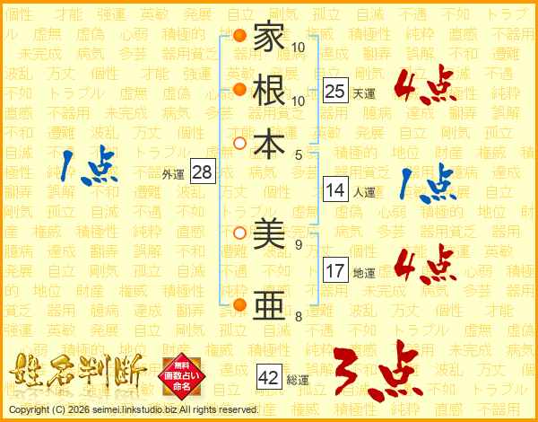 家(10画)根(10画)本(5画) 美(9画)亜(8画)