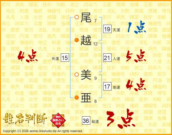 生活面を象徴する運勢です。外部から受ける影響力を表し、結婚運、家庭運や職場、環境への順応性を表します。総運から人運を引いた画数。姓や名が1文字の場合を除く。