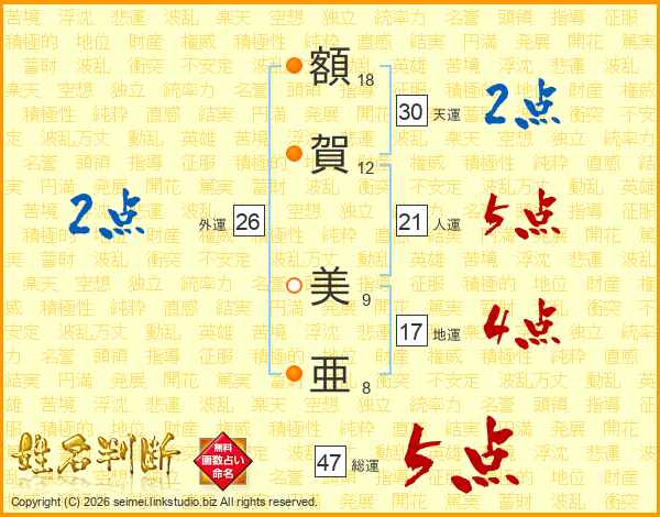 額(18画)賀(12画) 美(9画)亜(8画)