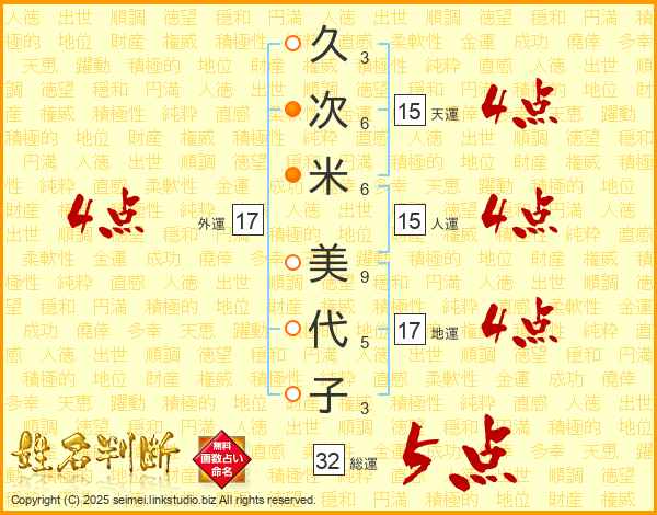 久次米美代子さんの総運は32画の5点!