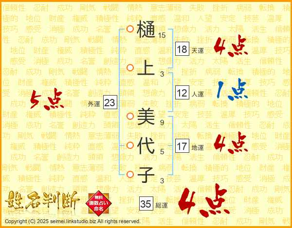 樋(15画)上(3画) 美(9画)代(5画)子(3画)