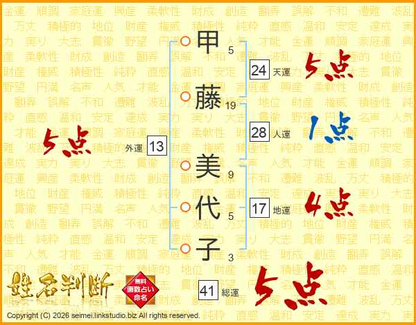 甲(5画)藤(19画) 美(9画)代(5画)子(3画)