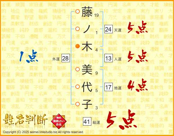 藤(19画)ノ(1画)木(4画) 美(9画)代(5画)子(3画)