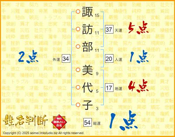 諏(15画)訪(11画)部(11画) 美(9画)代(5画)子(3画)