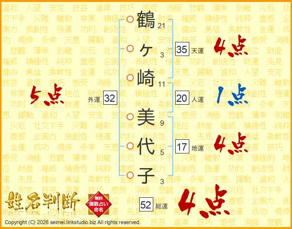 鶴ヶ崎美代子さんの総運は52画の4点!