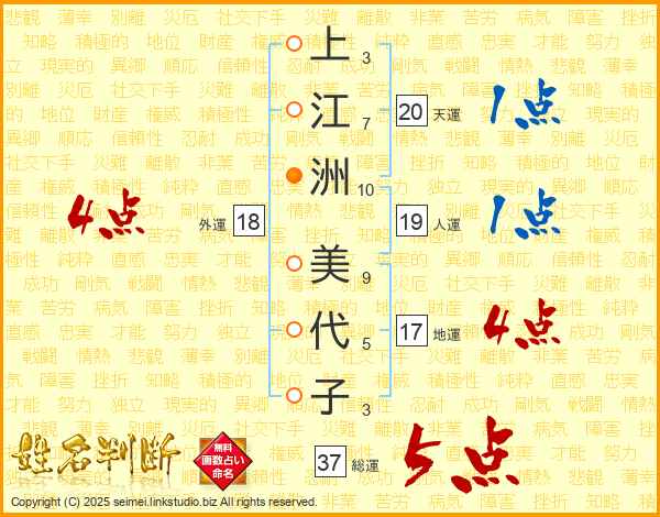 上(3画)江(7画)洲(10画) 美(9画)代(5画)子(3画)