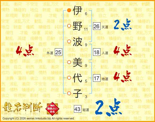 伊(6画)野(11画)波(9画) 美(9画)代(5画)子(3画)