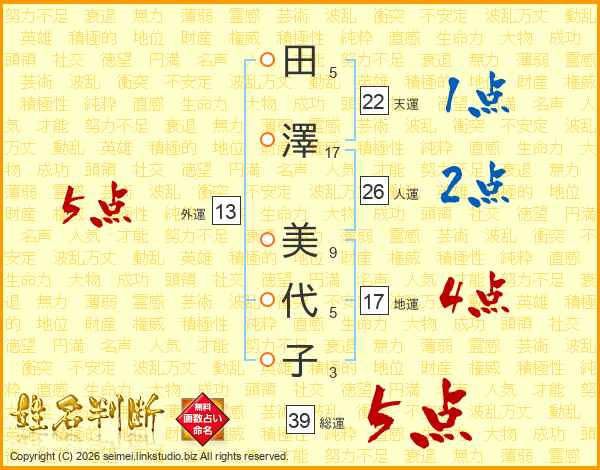 田(5画)澤(17画) 美(9画)代(5画)子(3画)