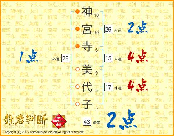 神(10画)宮(10画)寺(6画) 美(9画)代(5画)子(3画)
